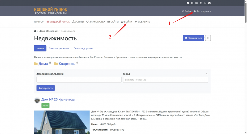 Зарегистрируйтесь на нашем портале "Клубфорум" и Войдите на сайт под своим логином (почта) и паролем . У нас быстрая регистрация менее 30 сек. Это можно сделать в шапке сайта справа на любой странице (см. 1 на рис) или нажав кнопку "Войти" в меню сайта (см. 2 на рис). После регистрации вы сможете бесплатно добавлять объявления в каталог, новости, подписываться и оставлять комментарии.